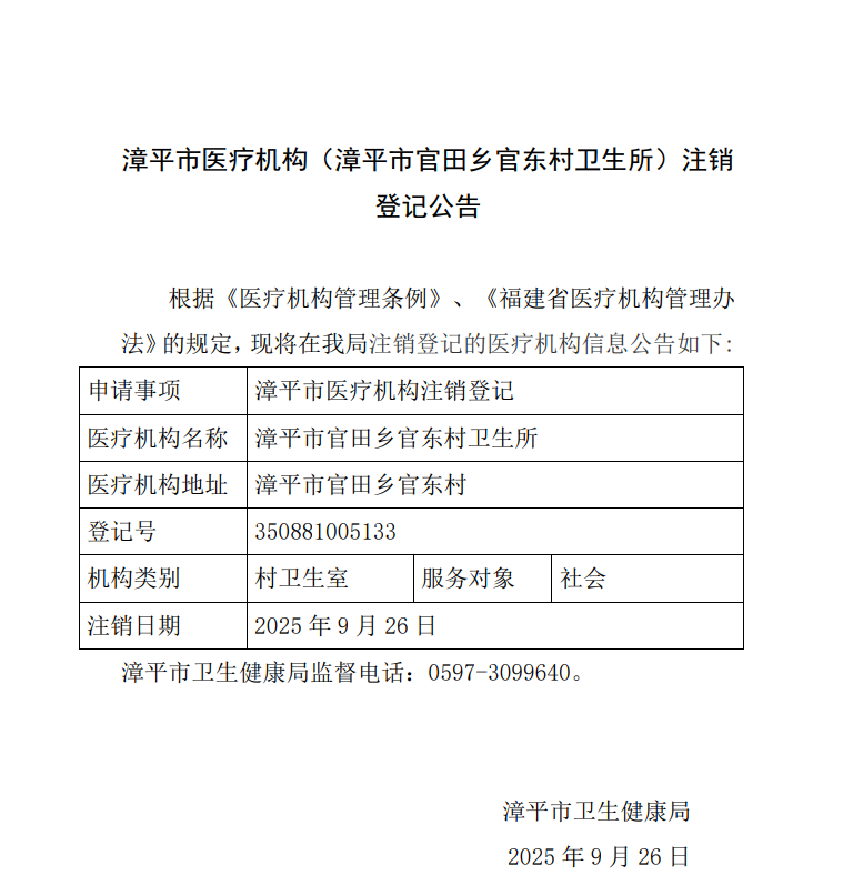 漳平市医疗机构(漳平市官田乡官东村卫生所)注销登记公告
