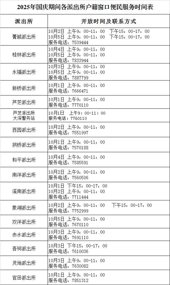 2025年国庆、中秋双节假期即将来临,为方便群众办理户籍业务,假期期间,漳平市公安局各派出所户籍室均有开通便民服务窗口。为避免白跑一趟,有相关业务需求的市民请提前电话预约。