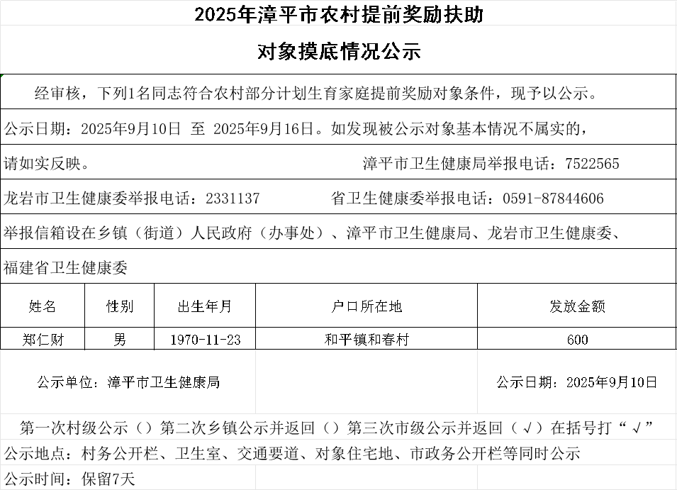 2025年漳平市农村提前奖励扶助对象摸底情况公示